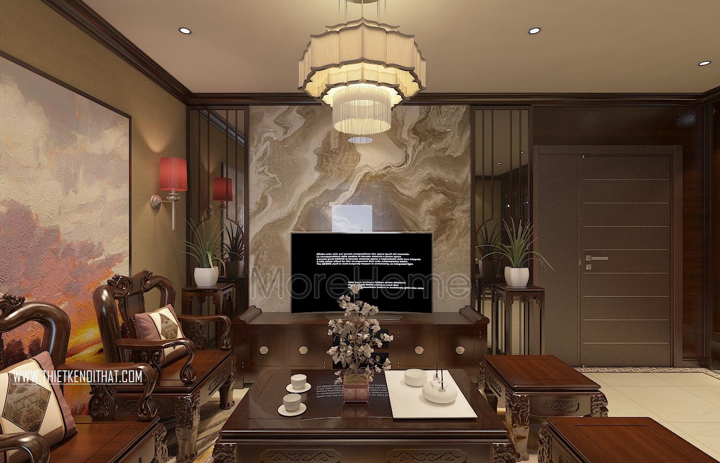 Bàn trà gỗ tự nhiên tại chung cư Hoàng Quốc Việt được thiết kế ấn tượng với phong cách Á Đông truyền thống. Toàn bộ nội thất phòng khách căn hộ chung cư Hoàng Quốc Việt được thiết kế 100% từ gỗ Việt.